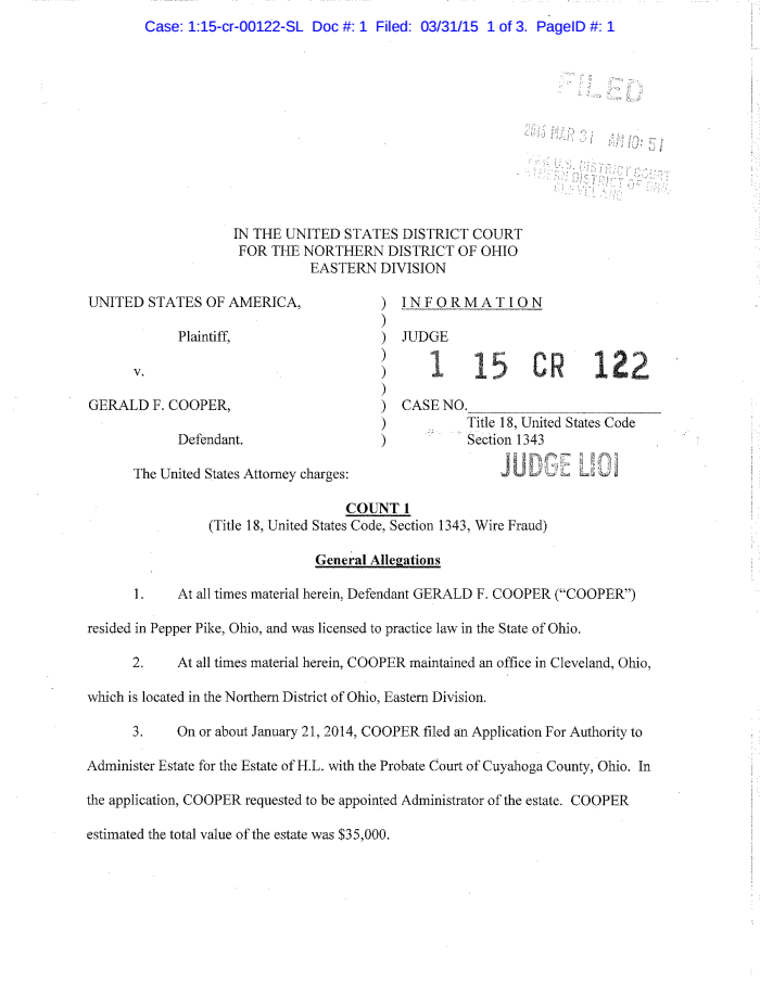 Cooper, a Pepper Pike resident, was admitted to practice law in Ohio in 1957. He is retired, according to the Supreme Court of Ohio's website.
