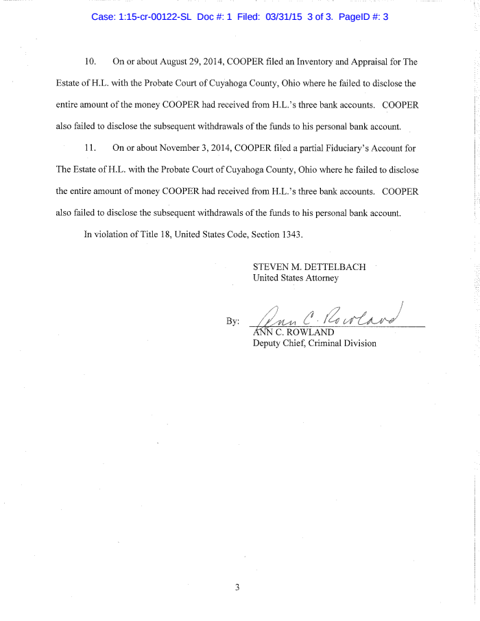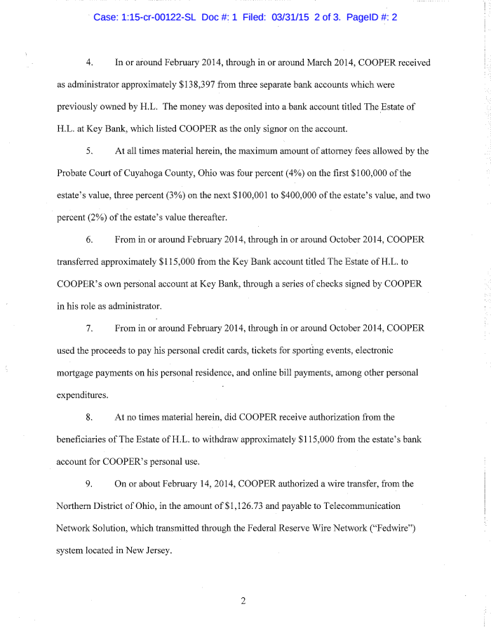 Gerald Cooper is charged in federal court with wire fraud for stealing from the estate of Henry Luke. He used the money to pay credit card bills, sports tickets and mortgage payments, among others, prosecutors allege.